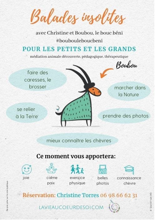 Vous avez envie d'une balade insolite? Boubou, dit Boubou le bouc béni, vous ne serez pas déçu. Il vous accompagnera pendant ce moment en nature qui vous apportera joie, ressourcement, nouvelles connaissances et de beaux souvenirs avenir.