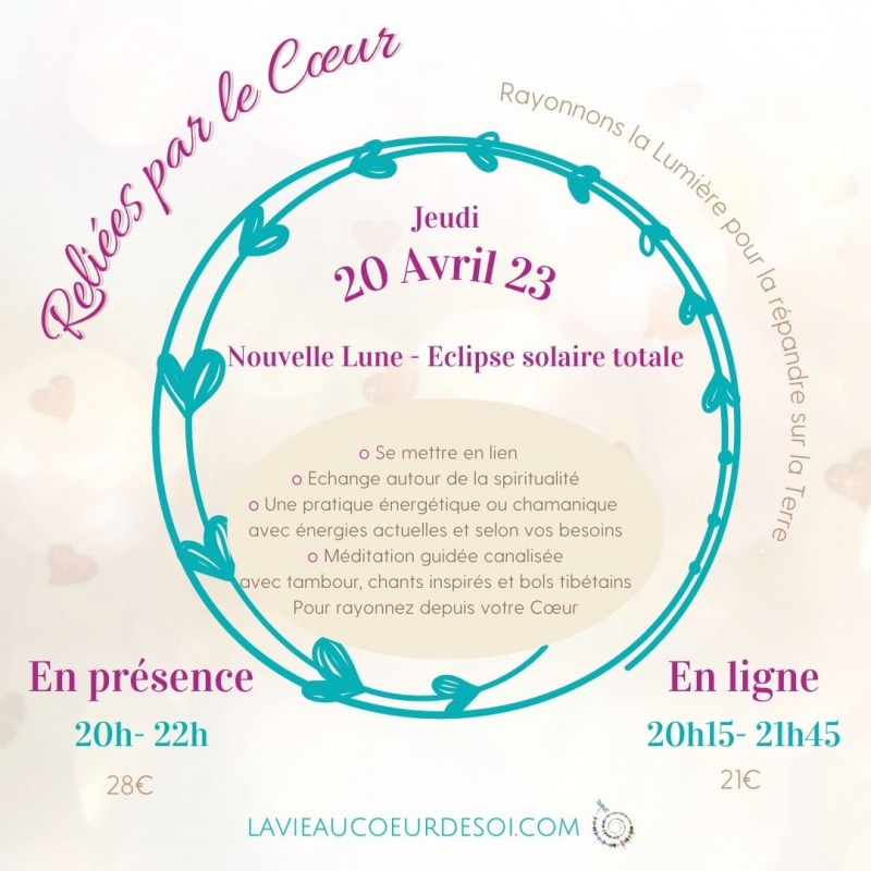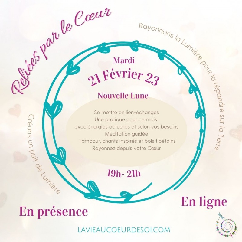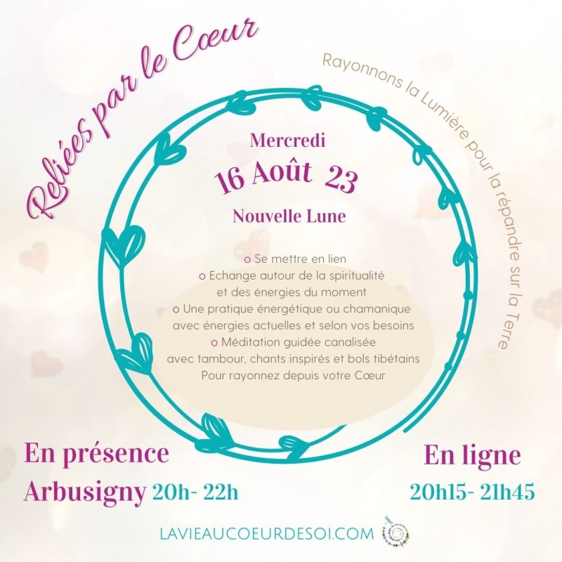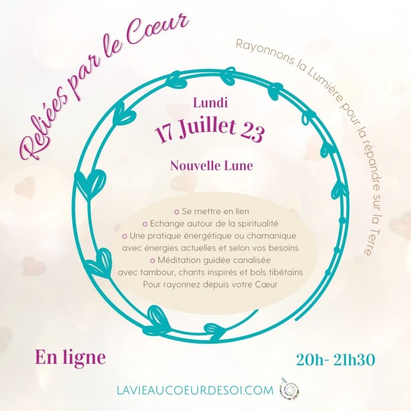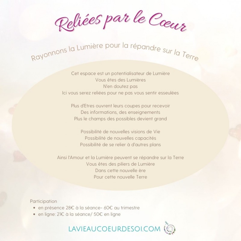 Cet espace est un potentialisateur de Lumière Vous êtes des Lumières N'en doutez pas Ici vous serez reliées pour ne pas vous sentir esseulées Plus d'Etres ouvrent leurs coupes pour recevoir Des informations, des enseignements Plus le champs des possibles devient grand Possibilité de nouvelles visions de Vie Possibilité de nouvelles capacités Possibilité de se relier à d'autres plans Ainsi l'Amour et la Lumière peuvent se répandre sur la Terre Vous êtes des piliers de Lumière Dans cette nouvelle ère Pour cette nouvelle Terre Comment s'entrainer à rayonner sa Lumière? - échanges autour de la spiritualité théorie et pratique - questions réponses - un exercice pratique pour ancrer la spiritualité dans la matière selon le besoin du moment - méditation guidée canalisée avec chants inspirés, bols tibétains, tambour ou autres instruments selon inspiration - vous recevrez ensuite le replay de la méditation. Si vous ne pouvez participer , vous pouvez recevoir la méditation canalisée, un ou 2 jours après. participation 12€ A quelle fréquence? Ce groupe aura lieu tous les mois au moment ou au alentour de la Nouvelle Lune, le meilleur moment pour l'introspection. Suivez l'actu pour voir si il est en présentiel, en ligne ou les deux! Pour qui? Pour tous ceux qui sentent l'appel du chemin intérieur, l'appel du Coeur pour rayonner l'Amour et la Lumière en gardant les pieds sur Terre. Force de constater que ce chemin d'évolution est surtout féminin, le nom de ce cercle sera Reliées par le Cœur, le féminin l'emporte. Ce cercle est aussi ouvert aux hommes si leur Cœur est appelé. Vos offrandes Voir onglet tarif , un peu plus bas