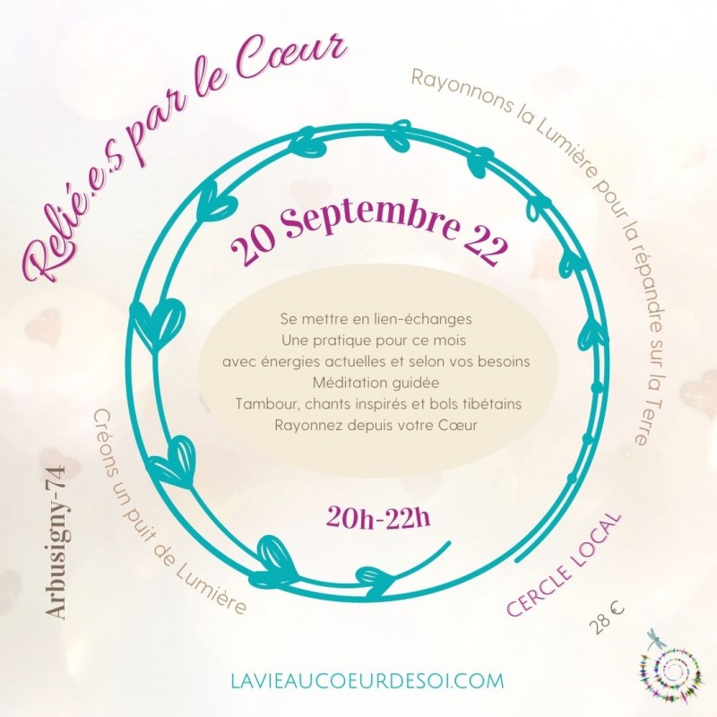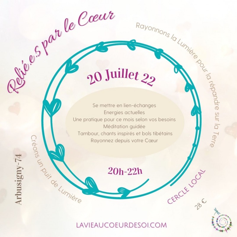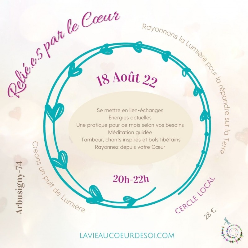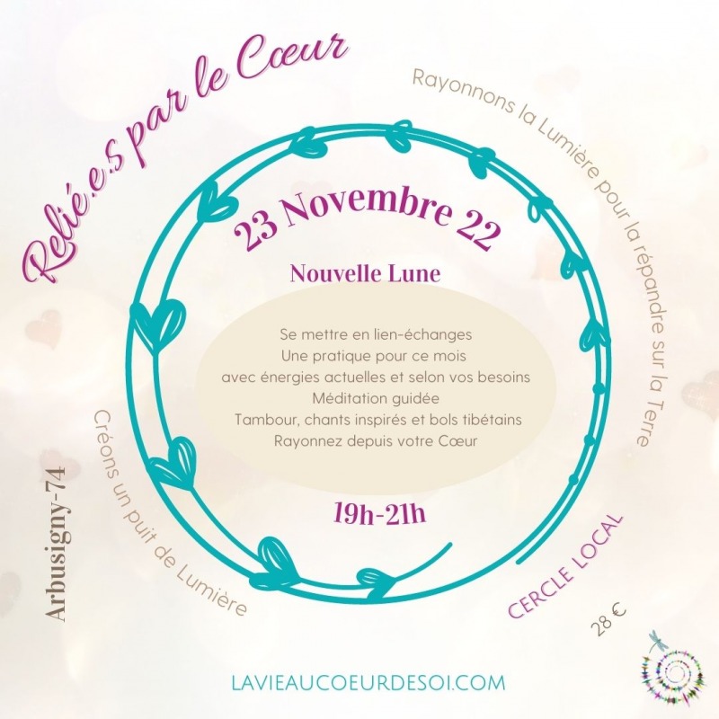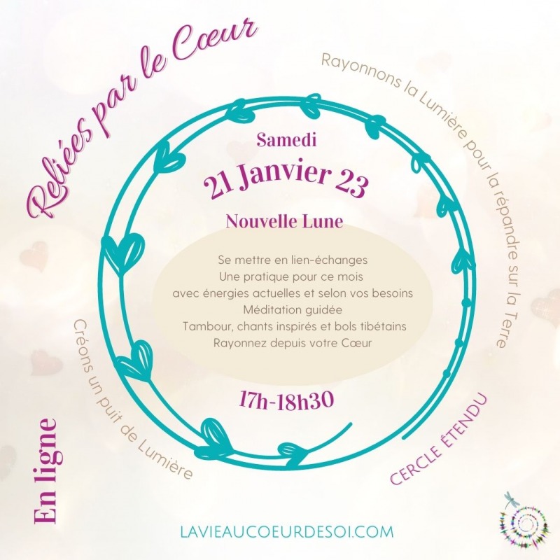 Cet espace est un potentialisateur de Lumière Vous êtes des Lumières N'en doutez pas Ici vous serez reliées pour ne pas vous sentir esseulées Plus d'Etres ouvrent leurs coupes pour recevoir Des informations, des enseignements Plus le champs des possibles devient grand Possibilité de nouvelles visions de Vie Possibilité de nouvelles capacités Possibilité de se relier à d'autres plans Ainsi l'Amour et la Lumière peuvent se répandre sur la Terre Vous êtes des piliers de Lumière Dans cette nouvelle ère Pour cette nouvelle Terre Comment s'entrainer à rayonner sa Lumière? - échanges autour de la spiritualité théorie et pratique - questions réponses - un exercice pratique pour ancrer la spiritualité dans la matière selon le besoin du moment - méditation guidée canalisée avec chants inspirés, bols tibétains, tambour ou autres instruments selon inspiration - vous recevrez ensuite le replay de la méditation. Si vous ne pouvez participer , vous pouvez recevoir la méditation canalisée, un ou 2 jours après. participation 12€ A quelle fréquence? Ce groupe aura lieu tous les mois au moment ou au alentour de la Nouvelle Lune, le meilleur moment pour l'introspection. Suivez l'actu pour voir si il est en présentiel, en ligne ou les deux! Pour qui? Pour tous ceux qui sentent l'appel du chemin intérieur, l'appel du Coeur pour rayonner l'Amour et la Lumière en gardant les pieds sur Terre. Force de constater que ce chemin d'évolution est surtout féminin, le nom de ce cercle sera Reliées par le Cœur, le féminin l'emporte. Ce cercle est aussi ouvert aux hommes si leur Cœur est appelé. Vos offrandes Voir onglet tarif , un peu plus bas