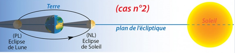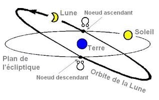 Une éclipse de Lune se passe toujours à la Pleine Lune puisque qu'elle se passe quand la Lune est alignée avec le Soleil et la Terre. Ce qui fait qu'elle ne se passe pas à chaque Pleine Lune, est l'inclinaison entre le plan d'orbite de la Terre autour du Soleil et celui de la Lune autour de la Terre En effet, si les 2 orbites étaient sur le même plan, il y aurait une éclipse de Lune à chaque pleine Lune et une éclipse de Soleil à chaque nouvelle Lune. Une éclipse de Lune se produit seulement si la Lune est assez proche du nœud ascendant ou du nœud descendant (= les points d'intersection des 2 orbites).