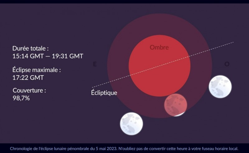 Comment voir cette éclipse? Elle aura lieu le 5 mai à partir de 17h14 heure de Paris 17h14 début de l'éclipse 19h22 l'éclipse atteint son maximum 21h31 fin de l'éclipse