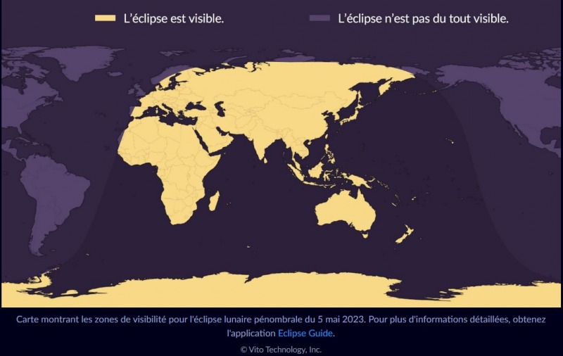 Ce sera l'éclipse lunaire pénombrale la plus profonde jusqu'en septembre 2042. Cependant, les éclipses pénombrales sont les éclipses lunaires les plus subtiles et sont difficiles à observer. Il n'y aura pas une partie de l'astre qui sera occulté complètement comme avec une éclipse partielle ou totale. Ici, c'est comme un voile qui se pose sur la Lune car seule l'ombre extérieure de la Terre, la pénombre, tombe sur le disque lunaire. Vous aurez besoin d'un temps parfait et de patience. Croisons les doigts pour le ciel soit dégagé sinon connectons nous à notre ciel intérieur! Elle est visible à l'œil nu, sans danger pour les yeux. Pour plus de détails et voir la beauté d'un peu plus près, n'hésitez pas à utiliser les jumelles et même un télescope. Où voir cette éclipse? Elle sera visible dans une grande partie de l'Europe, de l'Afrique, de l'Asie et de l'Australie.