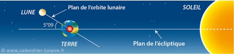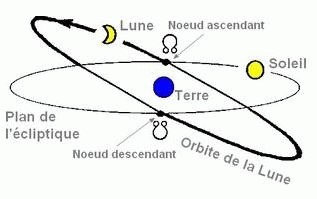 On peut distinguer 3 types d'éclipses lunaires : • Éclipse totale ⇒ La Lune traverse le cône d'ombre de la Terre tout en étant très proche de l'écliptique, donc bien alignée avec le Soleil et la Terre • Éclipse partielle ⇒ La Lune traverse partiellement le cône d'ombre de la Terre car elle n'est pas parfaitement alignée avec la Terre et le Soleil • Éclipse pénombrale ⇒ La Lune ne passe pas dans le cône d'ombre de la Terre, mais simplement sa zone de pénombre Qu'est ce qui fait qu'une éclipse a lieu? C'est l'inclinaison entre le plan d'orbite de la Terre autour du Soleil et celui de la Lune autour de la Terre qui fait que les éclipses de Lune sont relativement peu fréquentes (une ou deux chaque année). En effet, si les 2 orbites étaient sur le même plan, il y aurait une éclipse de Lune à chaque pleine Lune et une éclipse de Soleil à chaque nouvelle Lune. Une éclipse de Lune se produit seulement si la Lune est assez proche du nœud ascendant ou du nœud descendant (= les points d'intersection des 2 orbites).