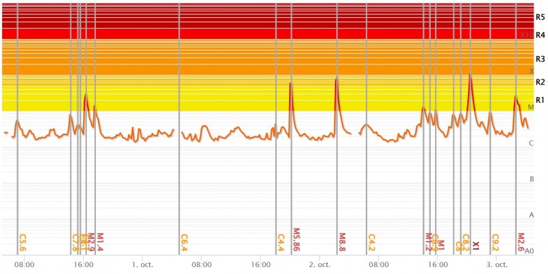 Elles sont classées en différentes catégories selon l'intensité maximale de leur flux énergétique en W/m2 dans la bande de rayonnement X de 1à 8 Les différentes classes sont A,B,C,M et X Chaque classe correspond à une éruption solaire d'une intensité dix fois supérieure à la précédente A les plus faibles, X les plus intenses. Au sein d'une même classe, les éruptions solaires sont classées de 1 à 10 selon une échelle linéaire (ainsi, une éruption solaire de classe X2 est deux fois plus puissante qu'une éruption de classe X1, et quatre fois plus puissante qu'une éruption de classe M5) A retenir qu'une forte projection qui n'émet pas face à la Terre aura toujours moins d'impact qu'une projection moindre dans la trajectoire de la Terre.