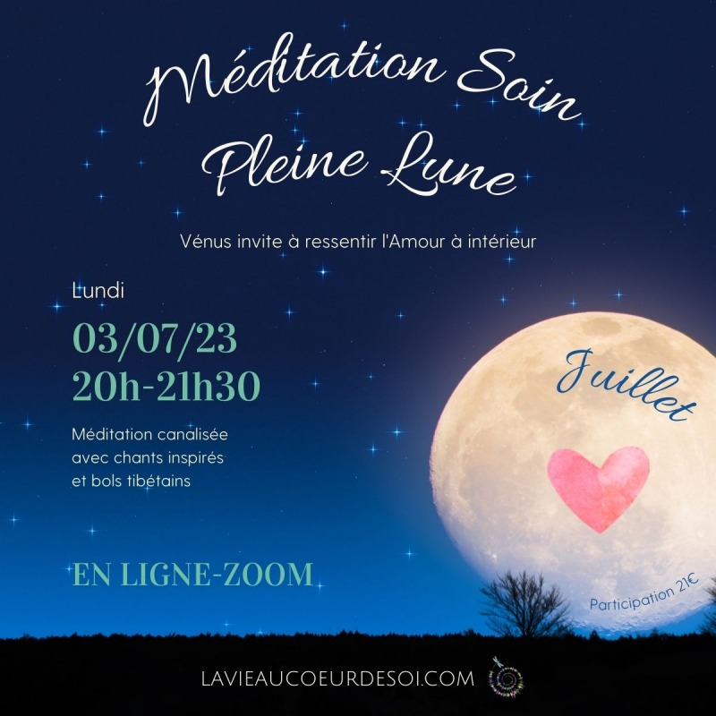 En présence, via zoom ou enregistrées, des méditations-soin pour vous aider dans votre cheminement spirituel. A la Pleine Lune ou à la Nouvelle Lune Elles sont canalisées, accompagnées de chants chamaniques, du son des bols tibétains, tambour et autres instruments. Nous prendront un moment avant de commencer pour parler des énergies présentes. Mettez vous en position de recevoir un soin ou une activation chamanique. Elles sont aussi une pratique pour avancer sur votre chemin dans ce monde en transition. Elles vous aident à: - vous renforcer physiquement et psychiquement - élever votre taux vibratoire - vous enraciner - vous aligner - ouvrir votre cœur - être plus à l’écoute de vous même - être plus à l’écoute de votre intuition - être plus lumineux - aller à la rencontre de notre Essence, la partie la plus lumineuse de votre être - vous relier à des êtres de hautes vibrations - à recevoir des transmissions vibratoires, de nouvelles fréquences, des activations Favoriser le changement extérieur, par le changement intérieur. Rayonnez votre Lumière Devenez une lanterne, un phare qui éclaire. Ces méditations sont proposées en intérieur, en pleine nature, en ligne et en enregistrement si vous n avez pu participer. Ecouter un exemple: