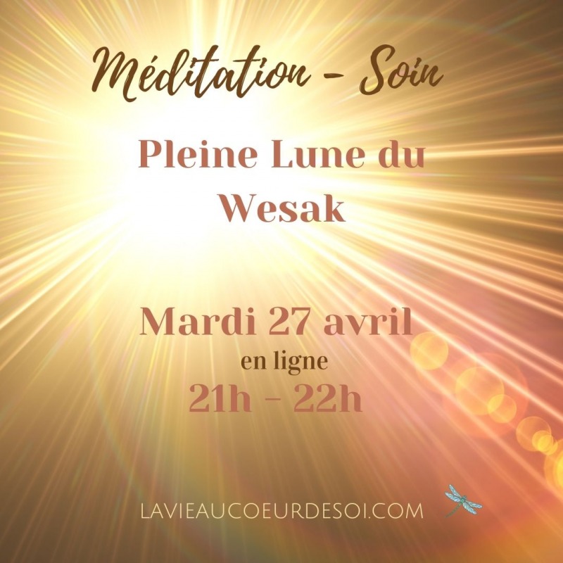 Pour en savoir plus, regardez ci dessous les différents thèmes et suivez l'agenda ou inscrivez vous à la newsletter. La prochaine sera: le lundi 3 juillet 23 La fête du Wesak est célébrée dans bien des parties du monde à cette Pleine Lune en Taureau. Pendant cette fête sont célébrées les bénédictions Christique et Bouddhiques qui descendent sur la Terre. Retrouver bientôt un article sur le Wesak Se connecter et recevoir, les énergies Bouddhiques et Christiques lors de cette fête du Wesak. Pour une réécoute à volonté quand cela vous convient, vous pourrez aussi commander l'enregistrement à la vieaucoeurdesoigmail.com. Vous recevrez le lien après commande. Une méditation pour sentir, ouvrir votre Cœur et sentir son puissant pouvoir transformateur. Après quelques mots d'explications et un chant inspiré en ouverture, je vous invite à rester en silence en attitude de réception. Vous pouvez relire le texte inspiré S'ouvrir à recevoir- la Coupe en lien avec cette méditation ici Une méditation soin où vous pourrez: - vous enraciner, vous connecter au plan céleste - vous nettoyer, harmoniser et aligner vos chakras - libérer certains blocages par votre nettoyage et les énergies, les fréquences que vous allez recevoir Une méditation pour : - bien s'enraciner - renforcer ses racines - stabiliser sa base Tel un arbre qui renforce ses racines pour aller plus haut.