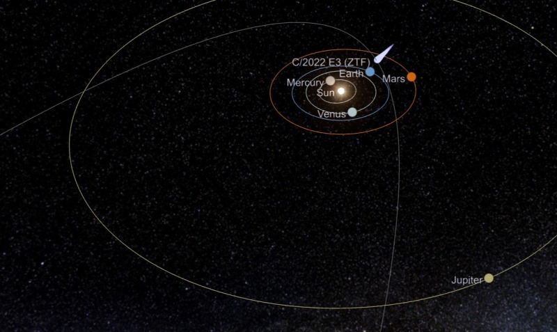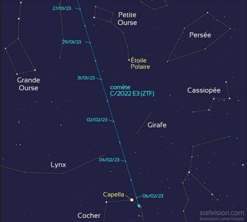 Elle est observable depuis le12 janvier, dans l'hémisphère nord, date à laquelle, elle a passé le point le plus proche du Soleil (périhélie) et a commencé à se diriger à l'extérieure du Système Solaire. Comme elle était loin de la Terre, sa magnitude (lumière) était plus faible. Le 1 février est le moment où elle sera le plus brillante, magnitude 5, car c'est le moment où elle sera le plus proche de la Terre • Dans la nuit du 29 au 30 janvier, la comète C/2022 E3 (ZTF) passera à 10° de Polaris (magnitude 2) dans la constellation de la Petite Ourse. • Dans la nuit du 1er au 2 février, elle passera devant la Terre et atteindra sa luminosité maximale. Elle traversera la constellation Camelopardalis. • Dans la nuit du 5 au 6 février, elle passera à 1°30' de l'étoile Capella (magnitude 0,1) dans la constellation du Cocher. • Dans la nuit du 6 au 7 février, elle passera à 10' de l'étoile Saclateni (magnitude 3,7) dans la constellation du Cocher.