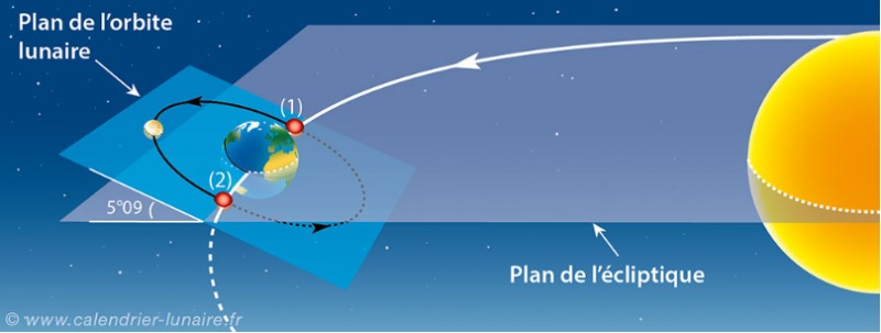 Qu'est ce qui fait qu'il n'y a pas l'éclipse tous les mois? Pour une éclipse de Soleil il faut que le nœud lunaire ai lieu au moment de la Nouvelle Lune. Qu'est ce qu'un nœud Lunaire? Astronomie: Le “nœud lunaire” le moment précis où la Lune traverse l’écliptique, c’est le moment où la Lune se trouve à l’intersection du plan de l’orbite lunaire avec celui de l’écliptique (correspondant aux positions des Lunes rouges sur les schémas).
