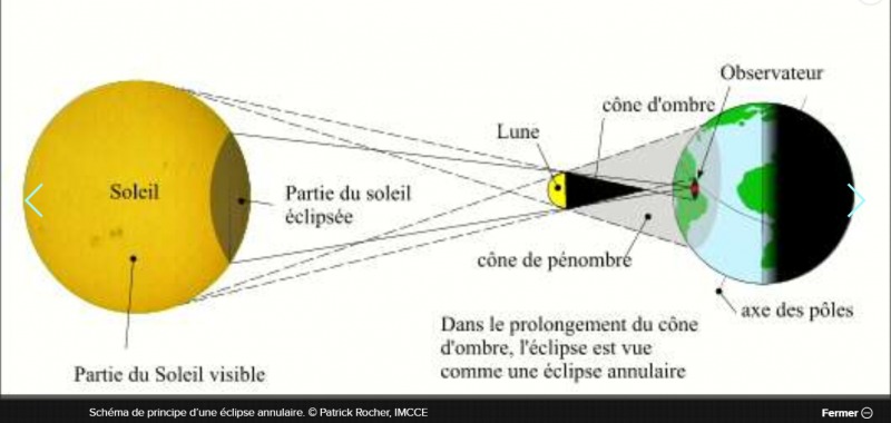 Lors de cette Nouvelle Lune aura lieu une éclipse solaire annulaire. Elle ne sera pas visible en France mais vous pourrait vous connecter à son énergie. Qu'est ce qu'une éclipse? C'est la disparition apparente et temporaire, de tout ou d'une partie un astre dans l'ombre ou la pénombre d'un autre. Eclipse de Lune et de Soleil Une éclipse de Lune se passe toujours à la Pleine Lune. Elle se passe quand la Terre est entre le Soleil et la Terre. En astrologie on parle d'opposition. Une éclipse de Soleil, se passe toujours à la Nouvelle Lune, quand la Lune est entre la Terre et le Soleil. C'est l'ombre de la Lune sur le Soleil. En astrologie , on parle de conjonction.