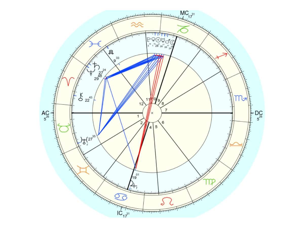Les planètes près du Soleil et de la Lune sont reliées par les aspects harmoniques (traits bleus) comme si elles apportaient leurs assistances pour ce changement.