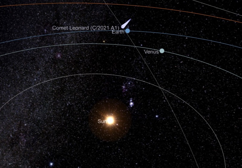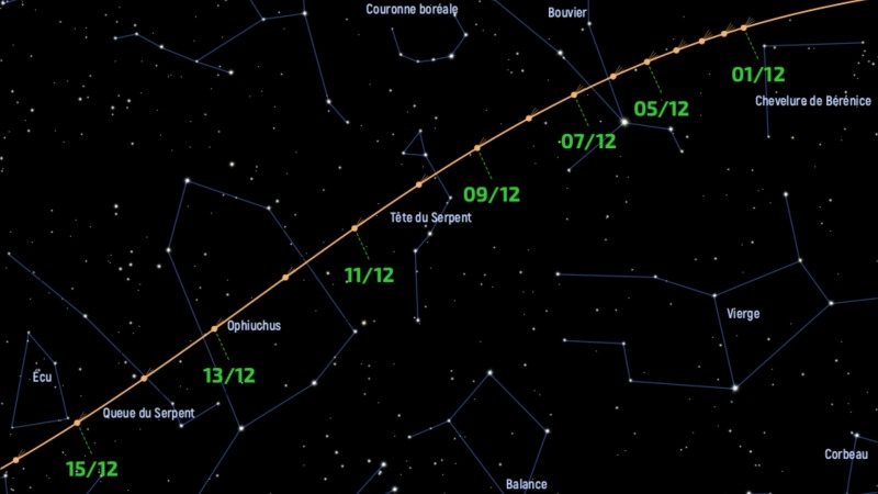Bonjour Il semblerait que le ciel va nous faire un beau cadeau de Noël avec un peu d'avance. Une nouvelle comète traverse le ciel, c'est la Comète Leonard. Elle apportera la Lumière du fond de l'Univers et poursuivra sa route vers l'infini sur une trajectoire hyperbolique. Sa Lumière bleue et sa chevelure en double queue, seront visibles à l'œil nu, le 12 décembre entre 6h30 et 8h30 pour apporter un peu de magie dans nos vies. Il est toujours difficile de prévoir l'avenir d'une comète lors de sa découverte car elle peut se désintégrer mais demain elle sera là pour notre plus grande joie et le ciel devrait se dégager pour nous permettre de l'observer! Qu'est-ce qu'une comète? Une comète est un astre composé d’un noyau solide, d'une tête et d'une queue qui est en orbite autour d'une étoile. Quand elle se rapproche de son étoile, elle subit un phénomène de sublimation, passage l’état solide à l’état gazeux. Là, les poussières et les gaz qui étaient gelés forment un halo qui crée la chevelure (ou coma). Le mot comète vient du grec ancien “ο komêtês” qui signifie “astre chevelu” Schéma d’une comète. Crédit : cpt flcn/CC BY-SA 4.0 D’où proviennent les comètes? Les comètes en balade dans notre Système solaire proviendraient de la ceinture de Kuiper et du nuage d’Oort. Pour rappel, la ceinture de Kuiper est la zone située au-delà de l’orbite de Neptune située entre 30 et 55 unités astronomiques (1 unité astronomique = 1 UA = 1 distance Terre-Soleil ~ 150 000 millions de kilomètres) et contenant une multitude de petits corps. Le nuage d’Oort serait lui beaucoup plus lointain, entre 20 000 UA et 100 000 UA et serait à l’origine de la plupart des comètes observées depuis la Terre : il en contiendrait plusieurs milliards. Le nuage d’Oort au-delà du Système solaire. Échelle de distances en Unités Astronomiques. Crédit : Nasa-JPL-Caltech Que savons-nous de cette Comète Leonard? Le 3 janvier 2021, un astronome américain, Gregory J. Leonard, a découvert une nouvelle comète à l'observatoire du Mont Lemmon, en Arizona, aux États-Unis. Cette comète sera vu qu'une seule fois, elle fait partie des comètes non périodique. Les comètes périodiques ont une période orbitale de 200 ans ou moins, c’est-à-dire qu'elles reviennent vers nous régulièrement. Elle a une trajectoire hyperbolique, cad que sa trajectoire se prolonge à l'infini. Elle traversera le système solaire qu'une seule fois. Elle avance a plus de 70 km /s, elle est plus rapide que la dernière comète que nous avons vu Neowise. Quand l'observer? Le 12 décembre, vous pourrez l'observer entre 6h30 du matin, moment où elle se lève et 8h30 ( heure francaise), moment où le soleil se lève. Ce jour elle passera proche de la Terre à une distance de 34 millions de km et sera plus brillante. Et après le 12 ? Le lundi 13 décembre, elle sera encore visible au crépuscule du matin, avant le lever du Soleil Entre le 13 et le 16 décembre, elle sera en conjonction avec le Soleil, ce qui la rendra plus difficile à voir à l’aube. Cependant, sa brillance pourrait être plus importante à cette période, du fait de « la diffusion en avant sur les poussières ». Le samedi 18 décembre, la comète passe tout près de Vénus. Comment l'observer? Elle sera visible avec des jumelles, peut-être même à l'œil nu le 12 décembre où elle sera le plus proche de la Terre. Où l'observer? Comme elle se déplace vite, elle va traverser plusieurs constellations Elle a été découverte dans la constellation des Chiens de chasse, elle est passée ensuite dans la constellation du Bouvier, près d'Arcturus, d'Hercule, celle du Serpent. Le 12 décembre, elle sera dans celle d’Ophiuchus, entre la tête et la queue du Serpent. Elle passera ensuite dans l'hémisphère sud , elle ne sera alors plus visible pour nous a partir du 25 décembre 21. Déplacement de la comète Leonard. // Source : IMCCE – Observatoire de Paris (image recadrée) Bonne observation du ciel!