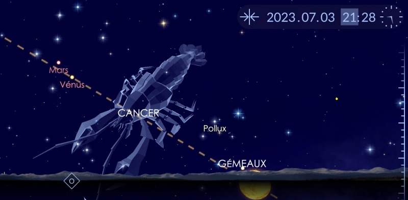 Mars et Venus seront conjoints dans le signe du Cancer. Après elle va rétrograder et Mars continuera sa route vers le Lion. On aura l'impression que Venus retourne en arrière , vue depuis la Terre (rétrogradation ) car elle est plus proche du Soleil que la Terre. Mars qui se situe après la Terre, dans l'ordre des planètes du système solaire continuera à s'éloigner.
