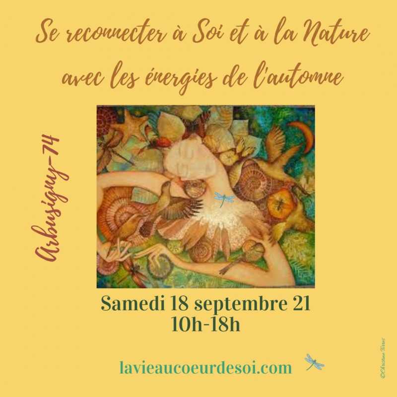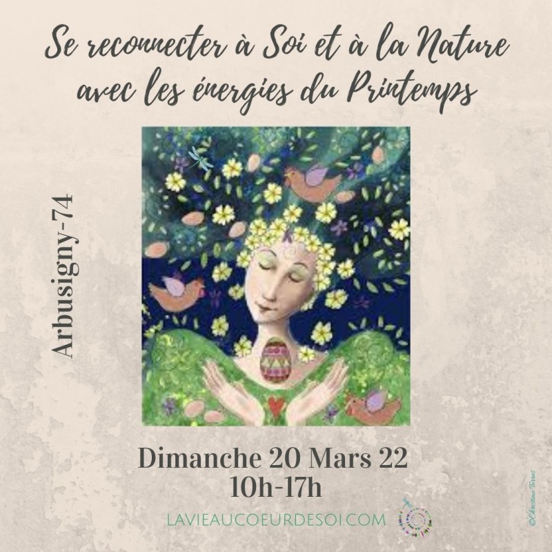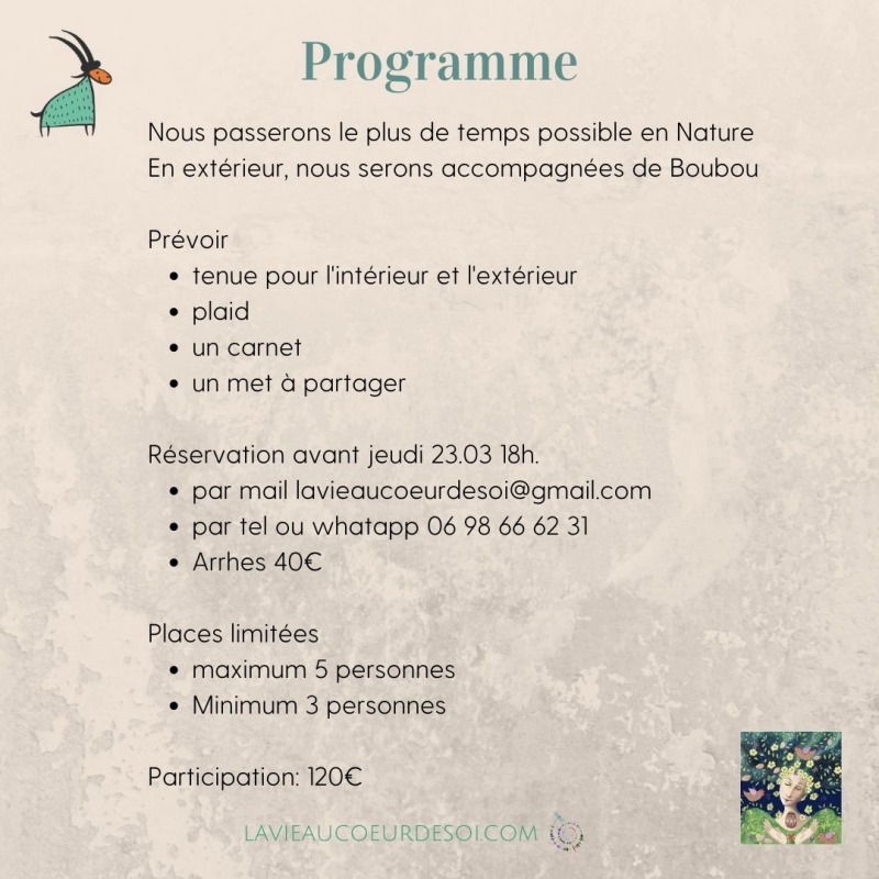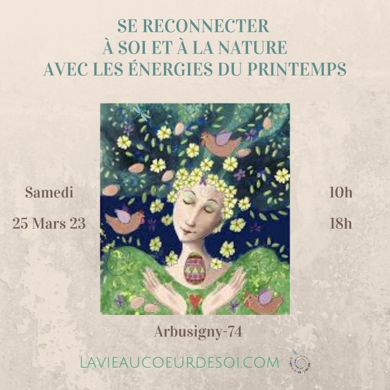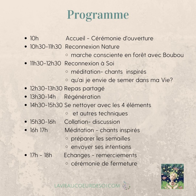 Une journée à chaque saison pour se reconnecter à Soi et à la Nature avec les énergies présentes. L'automne est presque là. Programme détaillé tout bientôt. Au printemps, la vie revient. Equinoxe le jour est égal à la nuit, équilibre Une journée pour - se poser, se ressourcer, se nettoyer - se relier à la Nature, aux Esprits de la Nature, aux 4 éléments - semer, créer - envoyer ses intentions à l'Univers En pratique 10h Accueil - Cérémonie d'ouverture 10h30-11h30 Reconnexion Nature - marche consciente en forêt avec Boubou -s'enraciner -un moment en silence pour se retrouver -admirer la beauté -se relier aux esprits de la Nature - se relier aux 4 éléments 11h30-12h30 Reconnexion à Soi - méditation- chants inspirés - qu'ai je envie de semer dans ma Vie? - Qui suis-je au fond de mon cœur? 12h30-13h30 Repas partagé 13h30-14h Régénération 14h30-15h30 Se nettoyer avec les 4 éléments et autres techniques 15h30-16h Collation- discussion 16h 17h Méditation - chants inspirés - que voulez vous rayonner - préparer les semailles - envoyer ses intentions ( quelques jours après la Nouvelle Lune, meilleur moment pour envoyer ses intentions 17h - 18h Echanges - remerciements - cérémonie de fermeture Quelques précedents évenements: